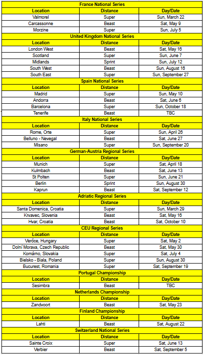 - Világbajnokságok (World Championships): Egy Világbajnoki esemény minden távhoz, beleértve a 100M, Sprint, Super, Beast, Ultra, Trifecta, World’s Toughest Mudder és DEKA bajnokságokat is.
